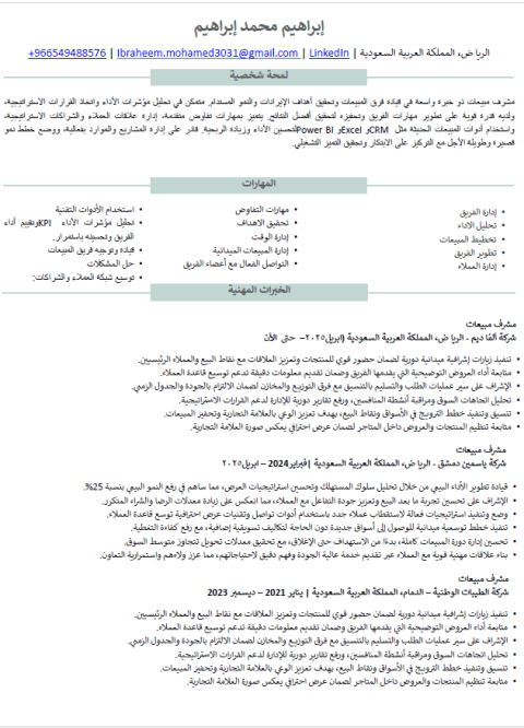 خريج بكالوريوس تربية رياضيه مندوب مبيعات خبرة 5 سنين في المبيعات عملت لدي المراعي وفأين فودز