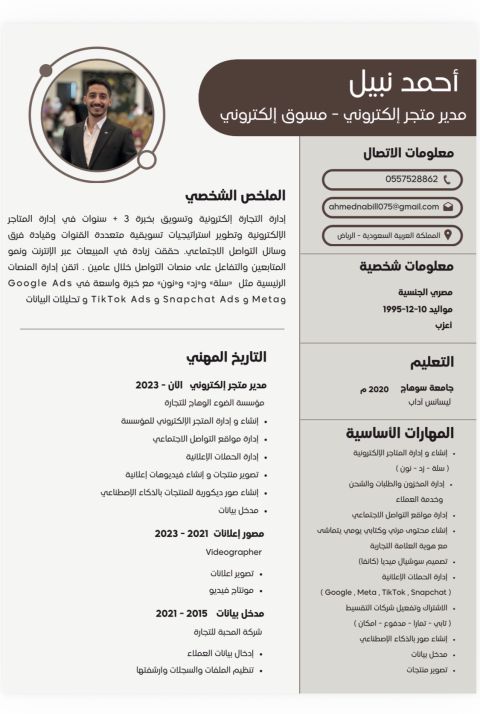 أنا اعمل كمسوق عبر قنوات التواصل الاجتماعي وتصميم وتنسيق المتاجر الالكترونية وعلي دراية كاملة بادراتها وانشاء حسابات دفع الكترونية مثل تابي وتمارا خبرة لمدة عامين بالسوق السعودي للتواصل