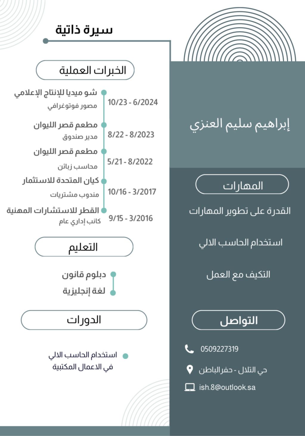 ابحث عن عمل (والمباشرة فورا) في مدينة حفر الباطن سعودي الجنسية مرفق لكم خبراتي التي تتجاوز 4 سنوات في مجالات مختلفة