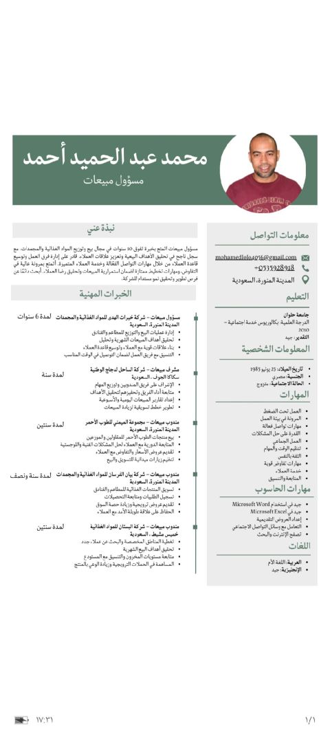 باحث عن وظيفة في مجال المبيعات والتسويق لدي خبرة تفوق 8 سنوات في مجال المبيعات والتسويق داخل المملكة، عملت على تحقيق الأهداف البيعية وبناء علاقات طويلة الأمد مع العملاء. أتميز بالقدرة على وضع الخطط التسويقية وتحليل السوق، وحاصل على بكالوريوس اعلام - قسم الاذاعة والتلفزيون