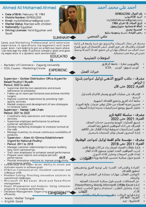 مندوب مبيعات جاهز للتعامل مع الأفراد والشركات، خبرة في اتمام الصفقات وتحقيق أهداف البيع. متابعة ما بعد البيع الالتزام بتحقيق التارجت ومتابعة البيع والتحصيل وفتح عملاء جدد وعمل خطة زيارات وارسال التقارير اليوميه والتنسيق بين العملاء وفريق المبيعات ومتابعة المطابقات بشكل دوري ولدي رخصة سارية وإقامة سارية
