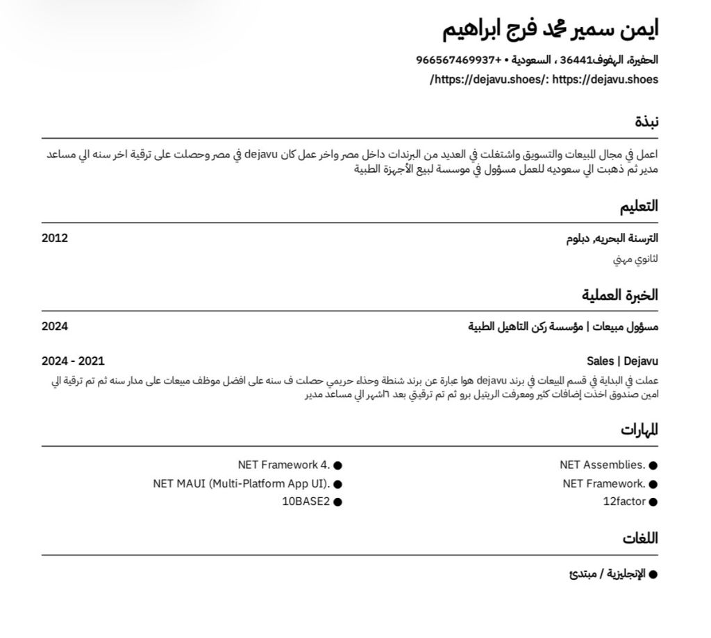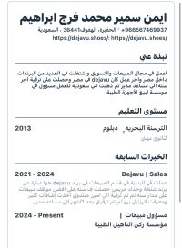 أنا أيمن سمير محمد مصري الجنسية اعمل في المملكة العربية السعودية منذ سنة في مؤسسة ركن التأهيل الطبية ابحث عن عمل لأسباب ضعف الراتب أنا وظيفتي مسؤول معرض أبيع وأحاسب العميل ومسؤول عن كل شيء اقامتي سارية حتى 2027 ابحث عن عمل في مجال المبيعات وجاهز لأي مقابله وشرح تفاصيل أكثر
