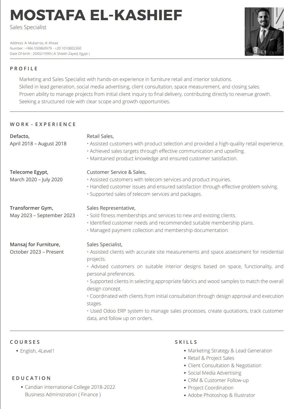 Marketing and Sales Specialist with hands - on experience in furniture retail and interior solutions. Skilled in lead generation, social media advertising, client consultation, space measurement, and closing sales. Proven ability to manage projects from initial client inquiry to final delivery, contributing directly to revenue growth. Seeking a structured role with clear scope and growth opportuniti