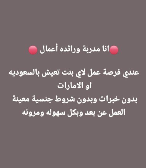 فرصة ما تتكرر لكل سيدة طموحة تبغى تبدأ من الصفر وتوصل للقمة عمل من الجوال دخلك بيدك. ونجاحك بقرارك انضمي لفريقنا الأقوى تعلمي، اشتغلي، وكبري دخلك وأنت في بيتك الفرصة للمجتهدات فقط العمل سلس مرن من بيتك ومن جوالك بدون خبرة بدون شهادة جاهزة تغيرين حياتك اكتبي أنا جاهزة ووراح أساعدك وأعلمك كيف تطلعي دخل من الجوال للتواصل