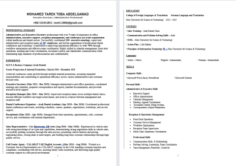 LL. B with 5 + yrs admin & legal support experience in Egypt & KSA. Skilled in customer service, document & contract management, legal compliance, Saudi platforms (Muqeem, Qiwa, Najiz) official correspondence, meeting coordination, reports & presentations (MS Office + Canva) Strong organization, flexibility, time management & adaptability. Jeddah resident - transferable Iqama