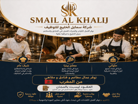 مكتب سمايل الخليج للاستقدام يوفر لكم كوادر فنادق ومطاعم ومقاهي من كل التخصصات / شيف عام وطهاة / حلوانيين وشيف بيكيري / معلمين بيتزا وفطائر ومناقيش / معلمين باريستا وعصاير / وجمع موظفين المطاعم والمقاهي بكفاءات عالية جدا / للطلب يرجى التواصل معنا عبر أرقامنا