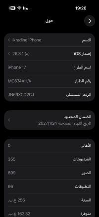 للبيع آيفون 17 سعة التخزين 256 غيغا بايت اللون أسود فضائي الجوال نظيف ما فيه ولا خدش صغير مركب عليها حماية للشاشة وللكاميرا الخلفية مركب عليه كفر للظهر استعمال خفيف الجوال أخو الجديد نسبة البطارية 100 بيجي معه الكرطونة والسلك والكتيب الجوال مشتريه من مكتبة جرير باقي على الضمان 22 شهر بيجي معه فاتورة الشراء من جرير البيع للجادين فقط السعر 3400 ريال