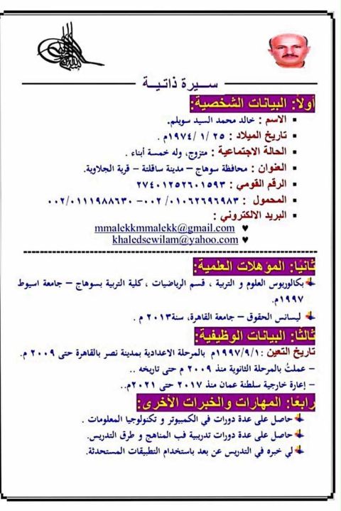 مدرس مصري حاصل علي بكالوريوس في العلوم والتربية قسم الرياضيات للتأسيس في جميع المراحل موجود في مصر يرغب في عقد عمل في مدرسة أو لدي أسرة خبرة 20 عام علي علم بجميع طرق التعليم الحديثة متزوج يوجد بالسيرة الذاتية الرقم المصري