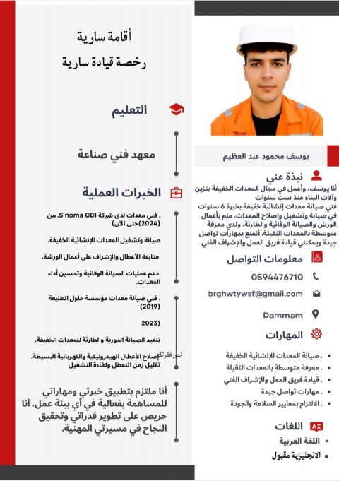 الاسم يوسف محمود عبد العظيم الإقامة سارية رخصة قيادة متوفرة الملخص المهني فني صيانة معدات انشائية خفيفة بخبرة 6 سنوات في صيانة وتشغيل واصلاح المعدات. ملم بأعمال الورش والصيانة الوقائية والطارئة، ولدي معرفة متوسطة بالمعدات الثقيلة. أتمتع بمهارات تواصل جيدة ويمكنني قيادة فريق العمل والاشراف الفني. الخبرات العملية. فني معدات لدى شركة Sinoma CDI. من (2024) حتى الآن)
