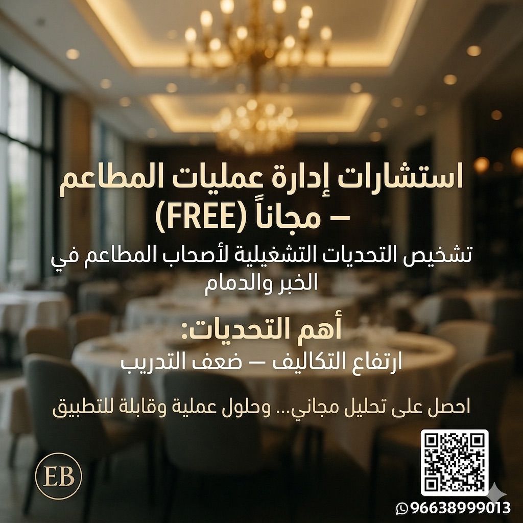 أقدم استشارة وتشخيص مجاني لأصحاب المطاعم في الخبر والدمام، بالاعتماد على خبرة محلية وعالمية في تشغيل المطاعم وتحسين الأداء. سأقوم بتحليل وضع مطعمك واقتراح حلول واقعية قابلة للتطبيق. وفي حال رغبت بتنفيذ الحلول ووضع خطة تشغيل كاملة، يتم تقديمها مقابل مبلغ يتفق عليه حسب حجم العمل والمعطيات