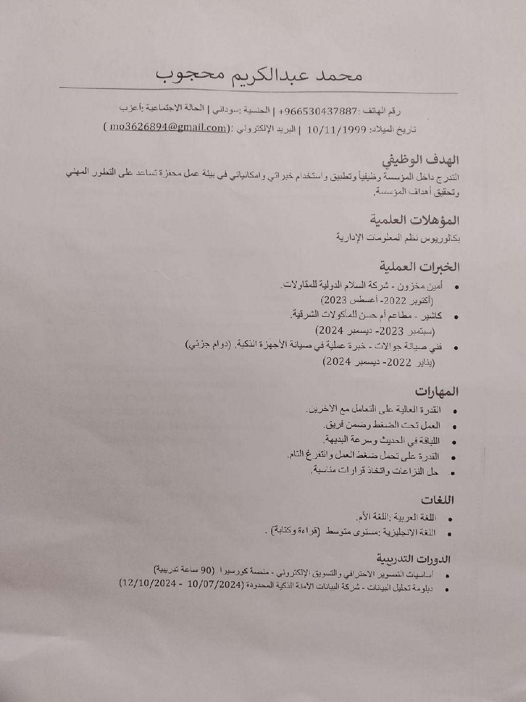 محمد عبد الكريم سوداني الجنسية خريج بكالوريوس نظم المعلومات الاداريه الخبرات العلمية (أمين مخزون - كاشير - فني صيانة جولات)
