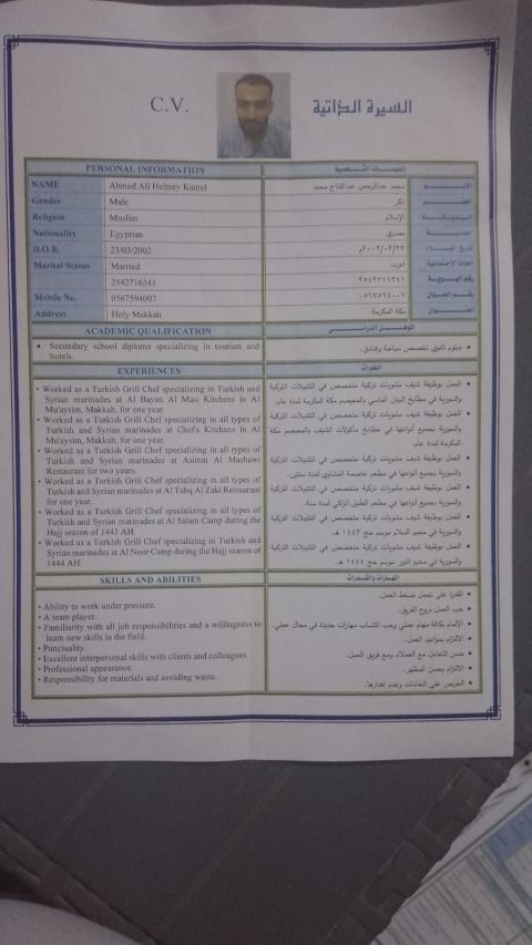الاسم أحمد محمد جمال الجنسية مصري العمر 30 سنة مقيم في الرياض مساعد شيف معجنات وفطائر وخليه سبق لي العمل في وادي الدواسر مطعم حلا وسيلا وأبها خليه خالد مهام عملي تحضير عجينة وفرد عجينة تحضير حشوات مختلفة القدرة على تحمل مسؤولية المكان والتعاون مع زملاء العمل / تلفون للتواصل