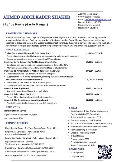 ابحث عن وظيفة مدير فرع. مشرف فرع مطاعم كافيهات حلا ومشروبات وبكري شوكلت خبرة في مجال الأغذية والمشروبات والبكري والكاترينج أكثر من 10 سنوات ادارة المبيعات وخفض التكاليف وعمل Inventory and waste ومتابعه اعمده الكوست الرئيسيه ورفع مستوى الخدمة والاشراف علي موظفي الخدمة وادارة الحجوزات ورفع تقييمات الفرع والاستماع الى مشكلات العملاء وحلها وتمرين الاصطاف ووضع جداول سير العمل إقامة كرت صحي ساري