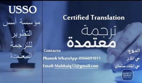 Certified translation with high quality and 25 years of experience. We provide fast, accurate translation for all languages and all official documents contracts, certificates, medical reports, commercial papers, passports, and licenses. High accuracy, fast delivery, competitive prices, PDF output, pickup at Al - Malz and King Salman branches