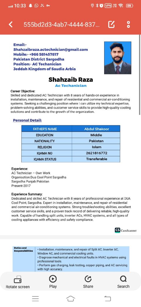 أنا فني تكييف، مكيف سبليت، مكيف نوافذ، مكيف مركزي، أي فني تكييف آخر، أقوم بتركيب مكيف جديد واصلاحه وغسله بالكامل. خبرتي العملية 12 عاما، الجنسية باكستانية أنن أبغى شغل شركة