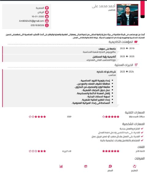 الاسم/ محمد أحمد عبدالرحمن. السن / 29 سنة. المؤهل / حاصل علي بكلوريوس عاوم ماليه اداريه تخصص محاسبه ابحث عن وظيفيه محاسب أو مبيعات أو كاشير. لدي خبرة كاملة في ادارة المعاملات المحاسبية ولدي خبرة في قسم مبيعات الرخام والسيراميك لمدة سنتين في المملكة لدي خبرة كاملة في كيفية الشغل علي كافة أنواع الكاشيرات. نحرص دائما علي الارتقاء بالعمل مهما كان وهدفنا الامانة في العمل وعدم وجود أخطاء بفضل ربنا