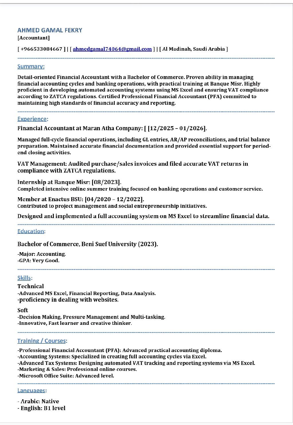محاسب متميز سريع التعلم بتقدير عام جيد جدا مستوى انجلش جيد قراءة وكتابة ومتوسط تحدث وأجيد المراسلات عبر البريد الألكتروني للتواصل مع العملاء والموردين خبرة في اعداد القيود اليومية مع فهم ومعرفة لمبادئ وأساسيات المحاسبة المالية ومستوى جيد في الاكسل مع القدرة علي انشاء سيستم محاسبي كامل علي الاكسل وتطبيق الدورة المحاسبية عليه واجادة التعامل مع موقع هيئة الذكاة والقدرة علي رفع الاقرار الضريبي