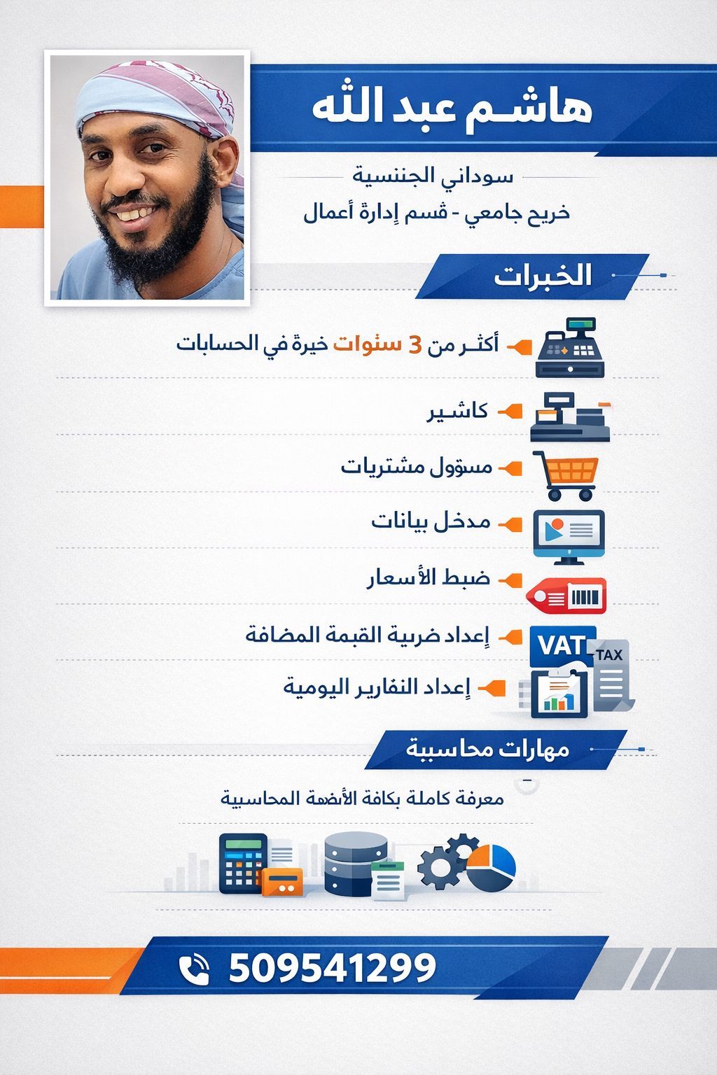 الاسم هاشم عبد الله سوداني الجنسية خريج جامعي قسم ادارة أعمال خبرة في مجال الحسابات أكثر من 3 سنة كاشير مسؤول مشتريات مدخل بيانات ضبط الأسعار اعداد ضريبة القيمة المضافة اعداد التقارير اليوميه معرفة بكافة الأنظم المحاسبية للتواصل