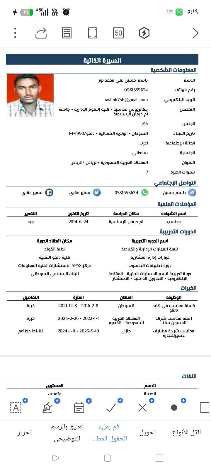 أنا اسمي باسم حسين علي محمد نور سوداني الجنسية خريج محاسبة وعندي خبرة في المملكة العربية السعودية