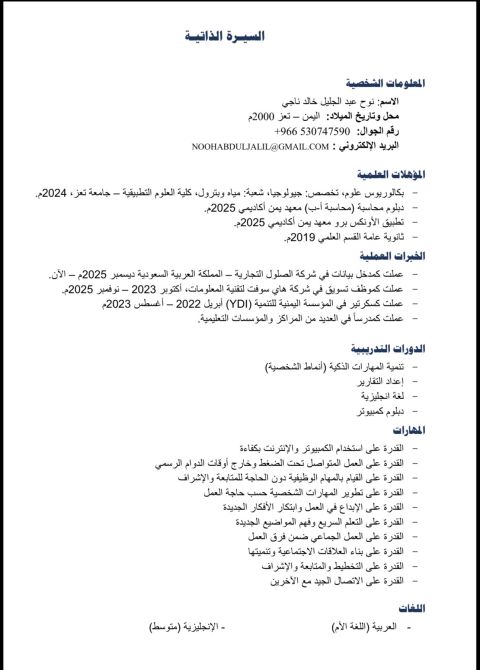 عمار عزت علي عمري 26. بكالوريوس محاسبة وتدقيق مالي. متمكن في الكمبيوتر وبرامج الأوفيس والأكسيل. لغة انجليزية جيدة تحدثا وكتابة. خبرة 3 سنوات 7 شهور في حسابات البنوك. خبرة سنة في ديوان المراجعة القومي. شهر في شركة الكهرباء حسابات. مقيم في جدة. إقامة عامل تحميل وتنزيل. جاهز بإذن الله للعمل. السيرة الذاتية مرفقة