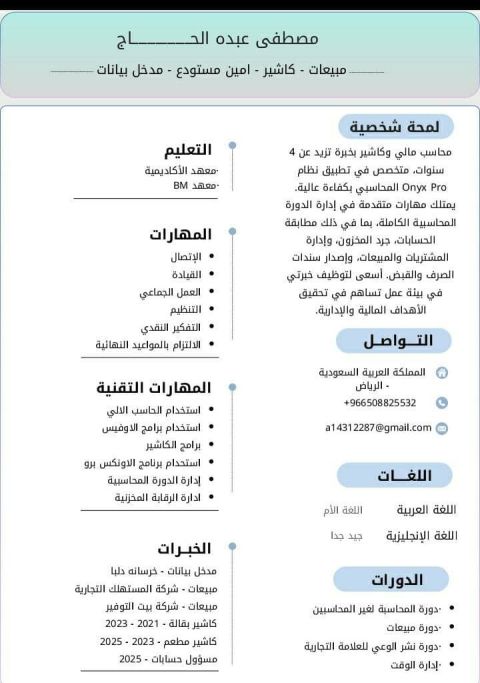 محاسب مصري مقيم في السعودية امتلك خبرة في الحسابات أكثر من 7 سنوات في حسابات عامة - مالية، ومقاولات، وزكاة وضرائب واداري موارد بشرية ومعرفة جيدة بالمنصات الحكومية وعمل القوائم المالية - وخبرة ببرامج ARB System وامتلك ICDL ودورة محاسب عام ودورة لغة انجليزية ومعي إقامة قابلة لنقل الكفالة ومعي رخصة قيادة سارية وجزاكم الله خير