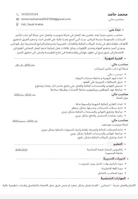 محاسب مالي خبرة أكثر من 3 سنوات في الأعمال المحاسبية وشاطر جدا في الاكسل