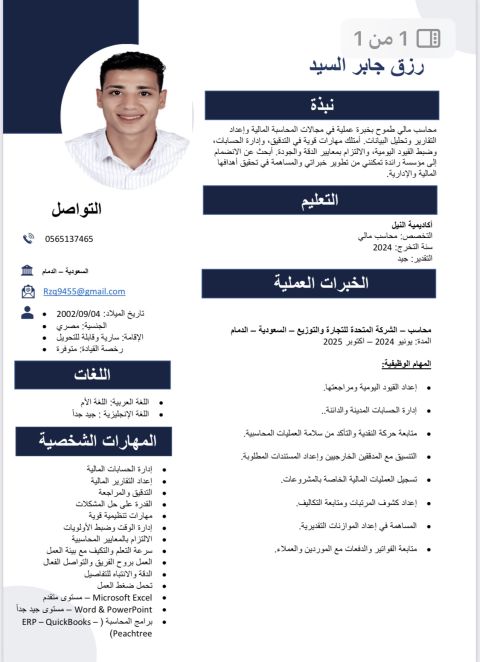 أنا محمد عوض محاسب خبرة 3 سنين في الحسابات وسنة في المبيعات وخدمة العملاء متواجد داخل المملكة العربية السعودية ابحث عن فرصة عمل جيده للتطوير من خبراتي أجيد استخدام برامج ERP واعداد القيود واعداد الفواتير ومتابعه السداد مع العملاء وأجيد استخدام الايميل ومايكروسوفت أوفيس ولدي خبرة في المبيعات واقناع العملاء بشهادة من الجامعة الأمريكية ومنظمة USAID الأمريكية