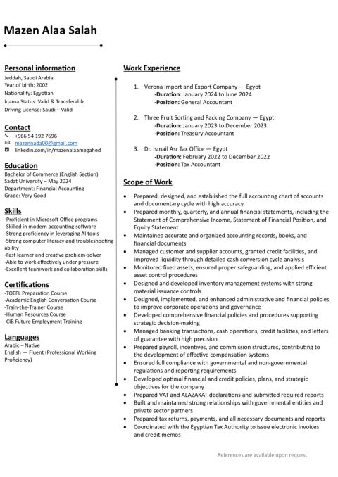 Looking for a Job Opportunity - Accountant Hello, I am an accountant with two years of experience, currently training at a shipping services company in Jeddah, Saudi Arabia. I have solid experience in accounting tasks, financial reporting, daily operations follow - up, and proficiency in accounting software. I am also fluent in English. My CV is attached in both Arabic and English
