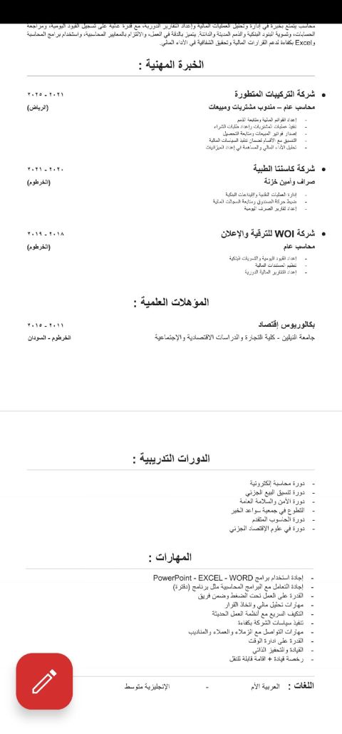 محاسب عام سوداني امتلك خبرة أكثر من خمسه سنوات داخل المملكة العربية السعودية أقامه سارية وقابلة للنقل رخصة سياقة سارية السيرة الذاتية علي الخاص موجود حاليا في الدمام ولا مانع من الانتقال الى مدينة أخرى