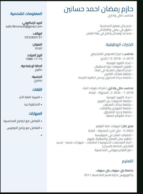 محاسب عام ابحث عن عمل خبرة في مجال الحسابات والمنصات الحكوميه وما يخص الموارد البشرية والاقرارات الضريبية والزكاة والعمل على برامج حسابان ERP