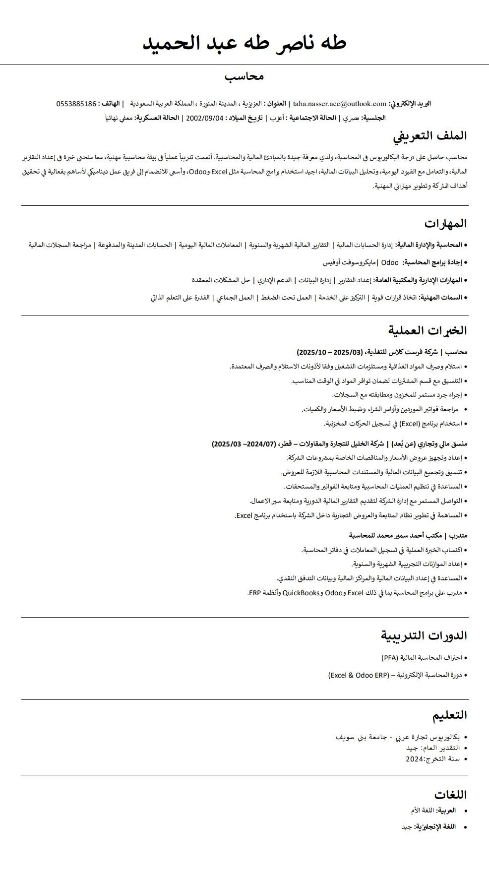 محاسب حديث التخرج وخبرة سنة في شركة تغذية، مصري الجنسية، ابحث عن عمل في المدينة المنورة