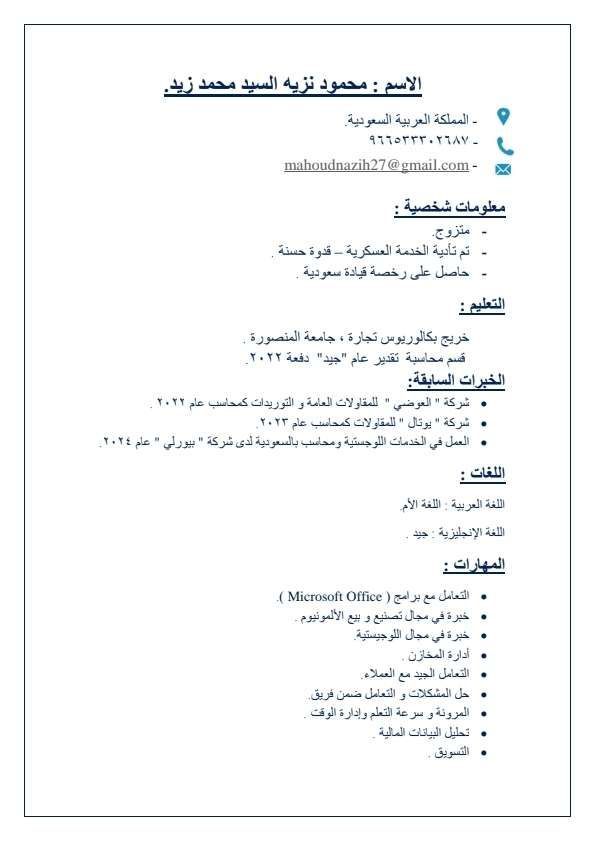 محاسب مصري خريج كلية تجارة، خبرة في مجال المحاسبة لمدة عام، خبرة في مجال المقاولات وخبرة في مجال الأعمال اللويستيه وقيادة فريق عمل خبرة في مجال الالوميتال ادارة وتسويق