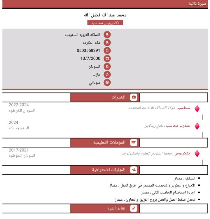 محاسب مالي واداري أجيد اعداد التقارير اليوميه والاقرار الضريبي وادارة المخزون وعمليات الادخال واعمل تحت الضغط وأحب التطوير من نفسي الجنسية سوداني العمر 25 سنة الخبرة 3 سنوات إقامة سارية ورخصة سارية