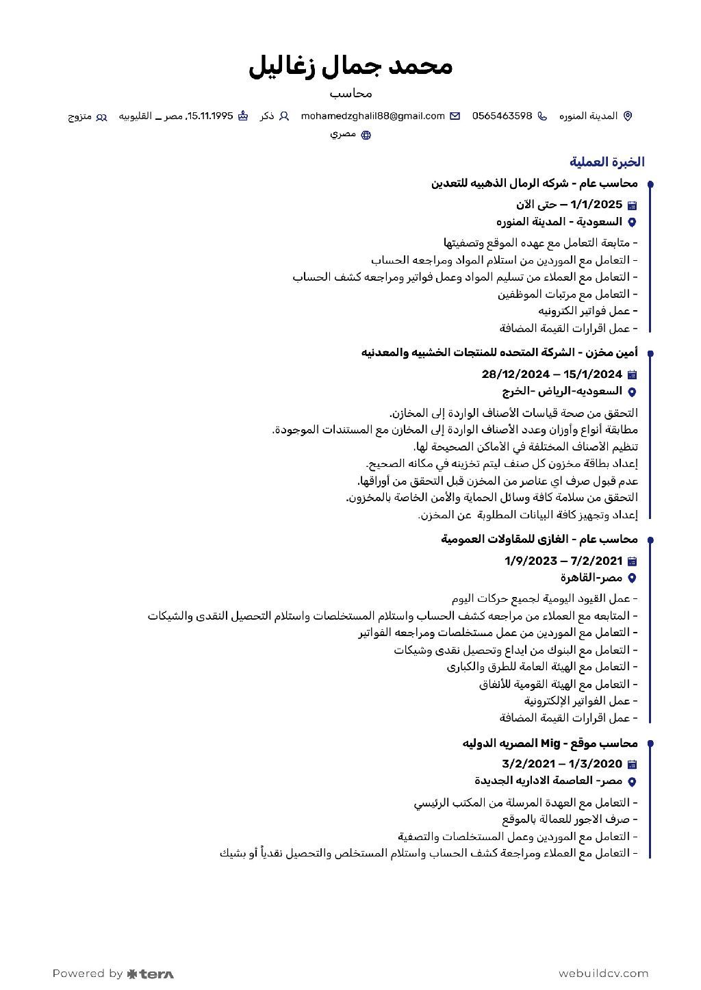 محاسب مقاولات امتلك خبرة في ادخال القيود اليومية، ومتابعه الحسابات البنكية، وتسوية العهد، وحسابات الموردين وحسابات العملاء، والعمل على الفواتير الالكترونية من المستخلصات والمشاركة في رفع الاقرار الضريبي، والعمل على برامج الأوفيس أكسيل ووورد، كما امتلك خبرة في التعامل مع برامج أل ERB بالاضافة الى إقامة سارية، المهنة (عامل تحميل وتنزيل) ولدى رغبة قوية في التطور الدائم ومواكبه الأحدث في مجالي