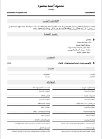 الاسم/ محمود أحمد محمود الجنسية / مصري حاصل على بكالوريوس تجارة قسم محاسبة وادارة أعمال أرغب في وظيفة تتناسب مع مهاراتي في نفس المجال خبرة ثلاث سنوات في مجال المحاسبه الماليه مع استخدام البرامج المحاسبية الحديثة