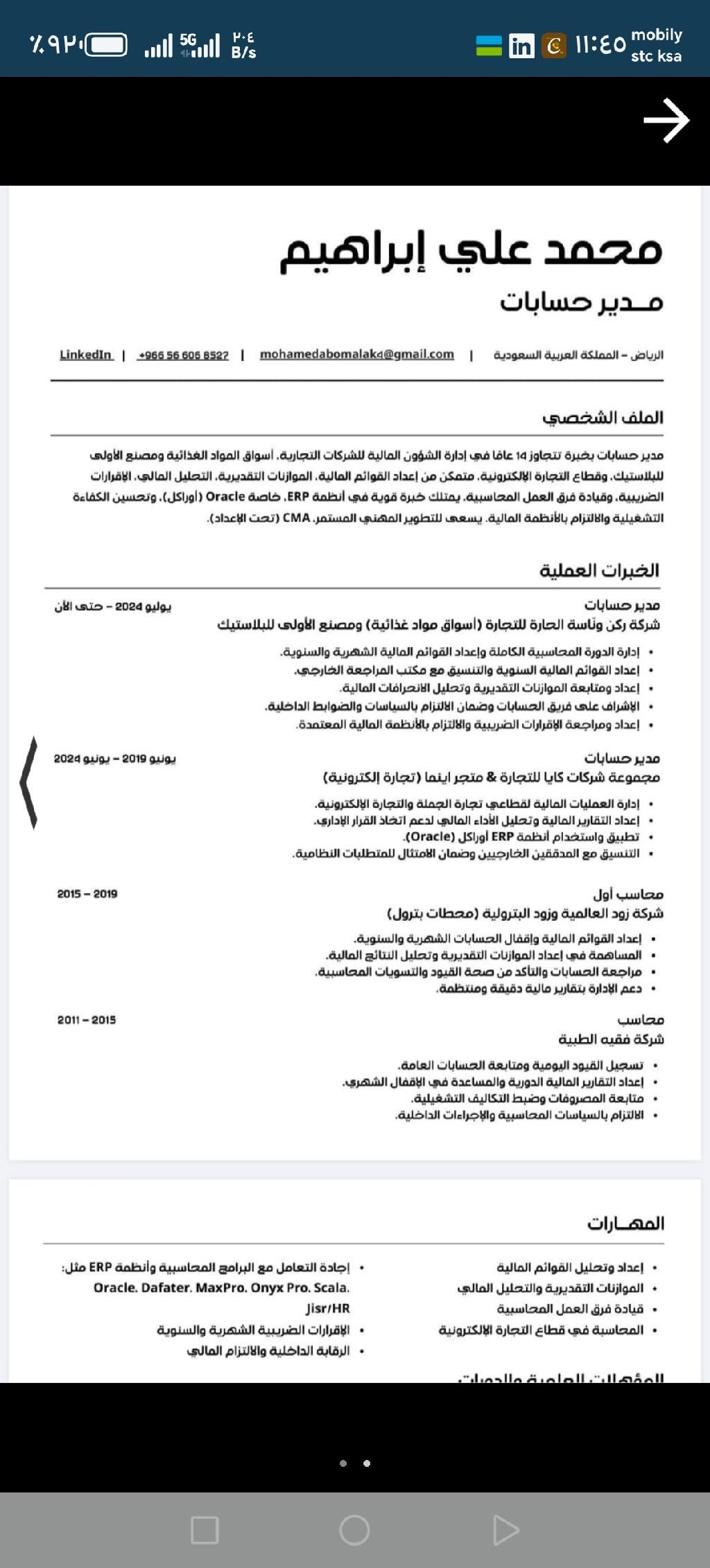 Accounts Manager with over 14 years of experience in managing the financial operations of commercial companies, the emarketing sector, the food industry, and AlOula Plastic Factory, in addition to practical expertise in accounting and financial control for fuel stations. Skilled in preparing financial statements, Proficient in ERP systems, particularly Oracle, CMA under studying