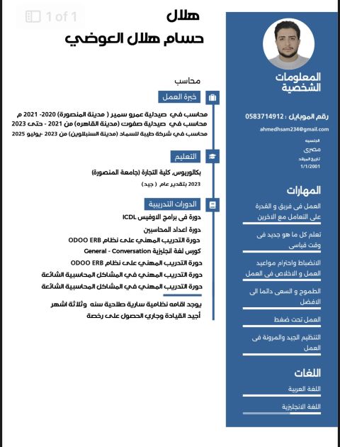 أنا اسمي محمد مصري الجنسية عندي 26 سنة معي بكالوريوس نظم ومعلومات اداريه ما يعادل كلية تجارة عين شمس خبرة بالحسابات اشتغلت محاسب في شركة راية في مصر اشتغلت في السعودية في مطعم كاشير بنظام فودكس وكنت ماسك حسابته والوارد والإيراد وكل هذه الأشياء حاليا شغال بمصنع في جدة تقني فني وكنت بدور علي فرصه أفضل