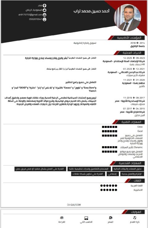 HR وخدمات عامة أجيد التعامل علي جميع المنصات الحكومية ابشر وقوي وناجز ومساند وبلدي ووزارة التجارة أجيد التعامل علي جميع المنصات الحكومية لوزارة النقل وبرنامج دىنامك لتأجير السيارات أجيد التعامل علي جميع برامج الكاشير كاشيرك - يلا بلس رتم - دفترة - البدر - بأوون EXDEF - Easacc - Fastich - Easy Store ترويج وبيع المنتجات الصيدلانية لمقدمي الرعاية الصحية، وبناء علاقات قوية معهم، وتحقيق أهداف أل