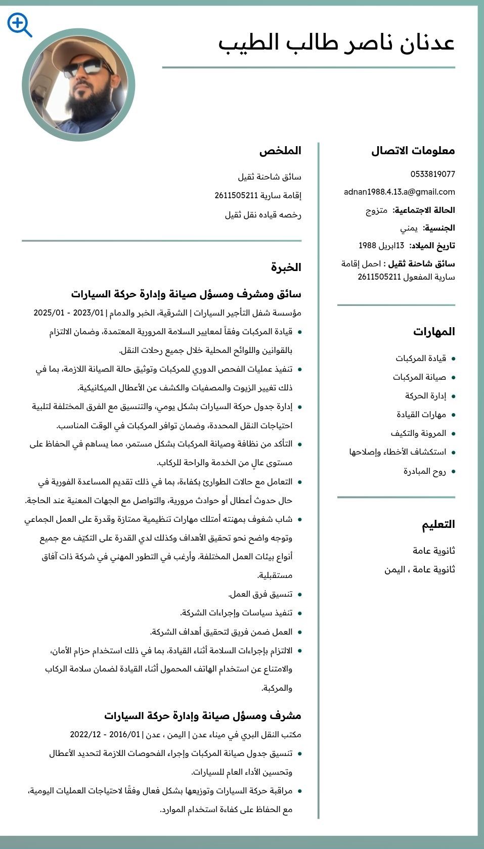 إدارة واشراف على حركة المركبات ومتابعة فريق العمل. الاسم عدنان العمر 37 سنة الجنسية يمني من محافظة عدن الموقع الدمام (ومتاح للانتقال لأي منطقة) الخبرات الاشراف الكامل على حركة السيارات وتنظيم عمليات التشغيل متابعة السائقين، التنسيق بينهم، وتوزيع المهام اليومية. تشخيص الأعطال ومتابعة ورش الصيانة الداخلية والخارجية. إدارة عمليات الصيانة الوقائية والتصحيحية. توفير قطع الغيار ومتابعة جودة العمل