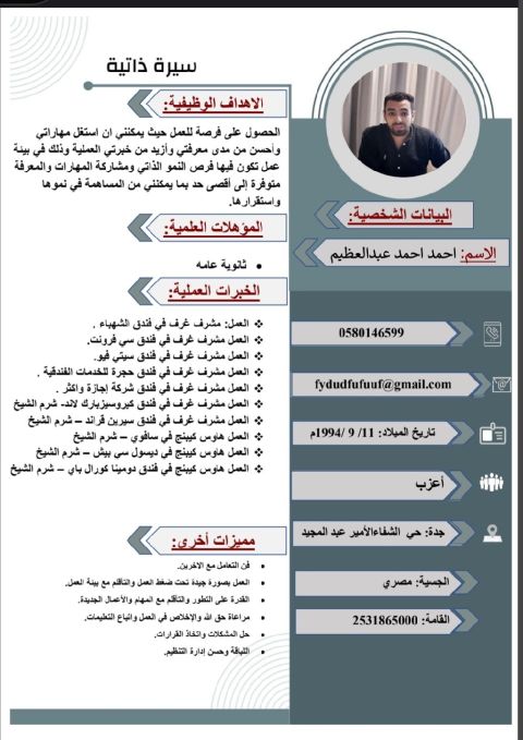 أنا شاب مصري طموح ابحث عن فرصة عمل تناسب خبرتي في موارد بشرية والخدمات العامة في كل ما يخص مسير الرواتب وانشاء عقود العمل الخ. أتميز بالدقة والالتزام بالمواعيد وقدرة على العمل الجماعي مع حرصي على تطوير مهاراتي باستمرار أطمح بيئة عمل حضارية تسعيللتطويرالنمو