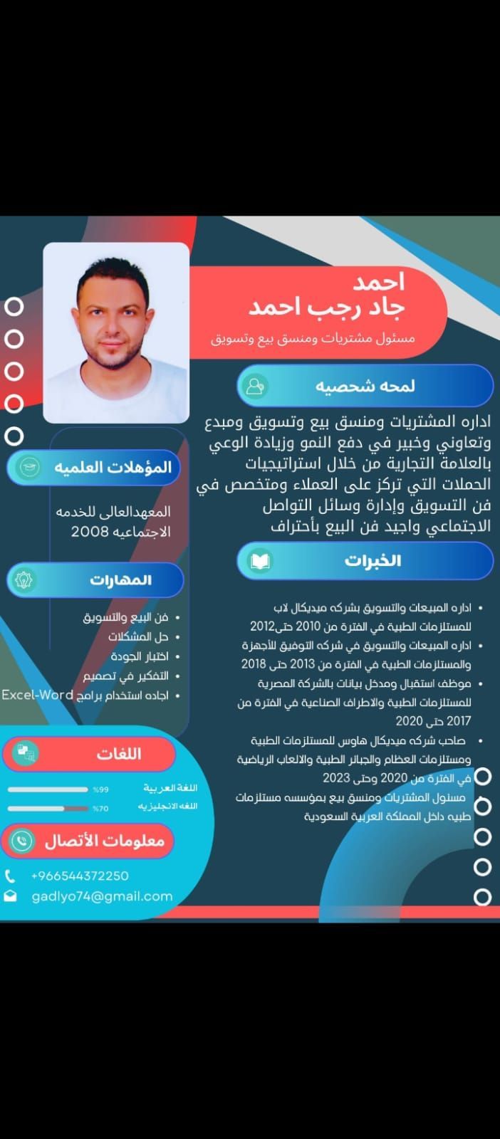 أنا مصري مقيم في جدة لدي خبرة كبيرة في مجال المستلزمات الطبية وكنت اعمل مسؤول مشتريات ومنسق بيع وتسويق واستقبال وتدوين السجلات ومتابعة الموردين ومقارنة الأسعار والاحتفاظ بالملفات ومتابعة حركة الأصناف والاكسبير واجادة برامج كمبيوتر برنامج المتفوق للمخازن والمحاسبة 2 برنامج دفترة والأكسيل
