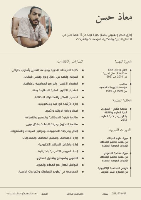 ابحث عن وظيفة في شركة تتناسب مع مؤهلاتي وخبراتي. أنا حاصل على بكالوريوس في العلوم الادارية ودبلوم في الاعلام - تخصص علاقات عامة واتصال جماهيري، كما درست دورة ICDL وأجيد استخدام Excel وWord باحتراف. لدي خبرة عالية في المجال الاداري والمبيعات والمشتريات، وأتميز بالقدرة على التنظيم، التواصل الفعال، وتحقيق أهداف العمل بكفاءة. أسعى للانضمام الى فريق عمل احترافي والمساهمة في تطوير أداء الشركة وتحقيق ر