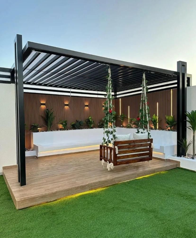تنسيق حديقة منزليه غرف زجاج عشب صناعي وطبيعي مظلات سواتر