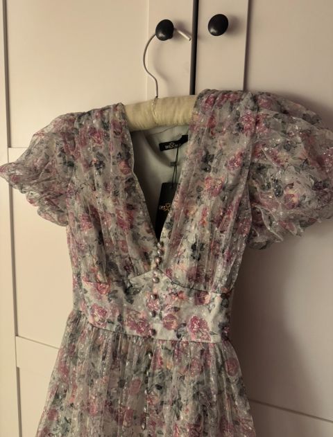 فستان فخم مورد بلمعة ساحرة من بوتيك EkSTRA، جديد تماما، مقاس M بسعر 150 ريال قابل للتفاوض - مثالي لاطلالة تخطف الأنظار