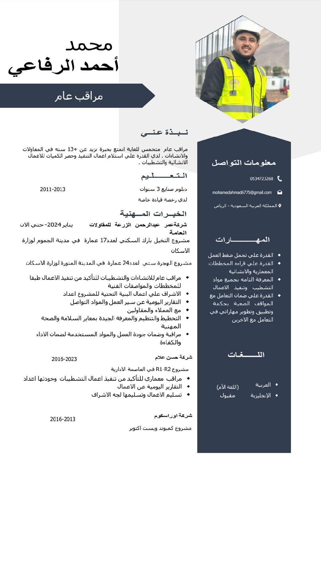 مراقب عام خبرة في مجال المقاولات والانشاءات والتشطيبات وتنفيذ المشاريع الضخمة والصغيرة من بداية الحفر الى التسليم النهائي على دراية كاملة بي استلام جميع بنود التشطيبات وتسليمها الى الاستشاري وعلي دراية كاملة بي أعمال الحصر وقراءة المخططات القدرة على توزيع العمالة ومتابعة أعمالهم ومتابعة المقاولين