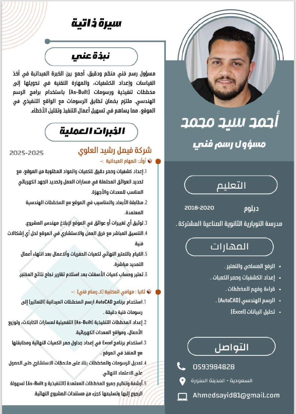 مسؤول رسم فني منظم ودقيق، أجمع بين الخبرة الميدانية في أخذ القياسات واعداد الكشفيات والمهارة التقنية في تحويلها الى مخططات تنفيذية ورسومات (As - Built) باستخدام برامج الرسم الهندسي. ملتزم بضمان تطابق الرسومات مع الواقع التنفيذي في الموقع، مما يساهم في تسهيل أعمال التنفيذ وتقليل الأخطاء