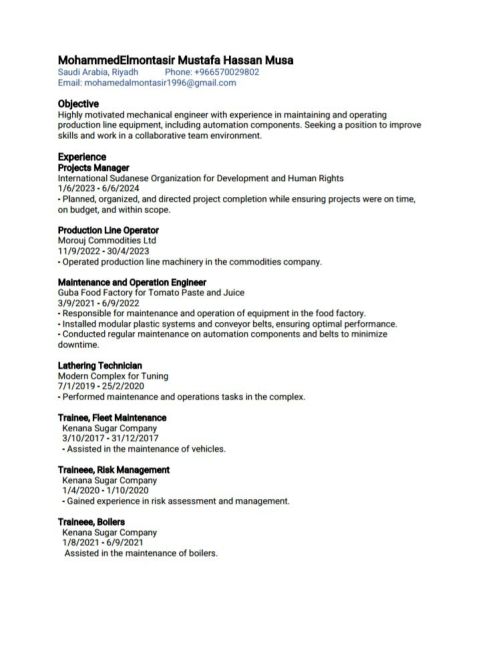 مهندس ميكانيكي خبرة أربع سنوات مع درجة البكالوريوس وخبرة متنوعة في إدارة المشاريع والعمليات والصيانة في قطاعات التصنيع ومعالجة الأغذية في وظيفة مهندس تشغيل وصيانة في شركتي مروج وقباء فوود. أثبتت القدرة على قيادة المشاريع الى الانتهاء بنجاح كمهندس مشاريع في المنظمة السودانية الدولية للتنمية وحقوق الانسان. عدة دورات تدريبية في مراقبة الجودة، وإدارة المخاطر، والسلامة، وإدارة المشاريع وMEP