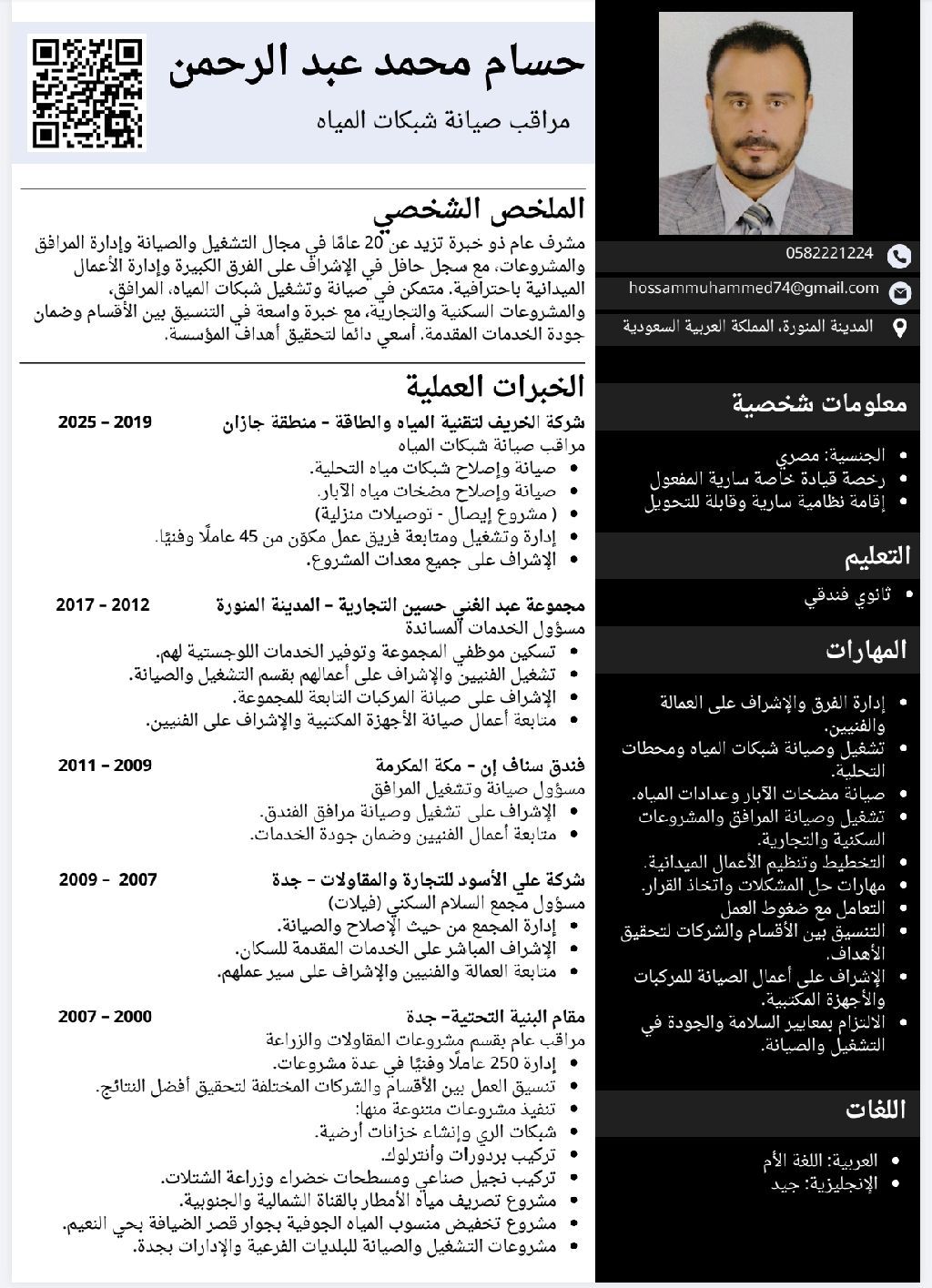 ابحث عن عمل المهنة بالإقامة مراقب صيانة شبكات مياه إقامة سارية المفعول قابلة للنقل رخصة قيادة خاصة سارية المفعول خبرة 15 سنة في السعودية بشركات المقاولات مرفق السيرة الذاتية جوالي
