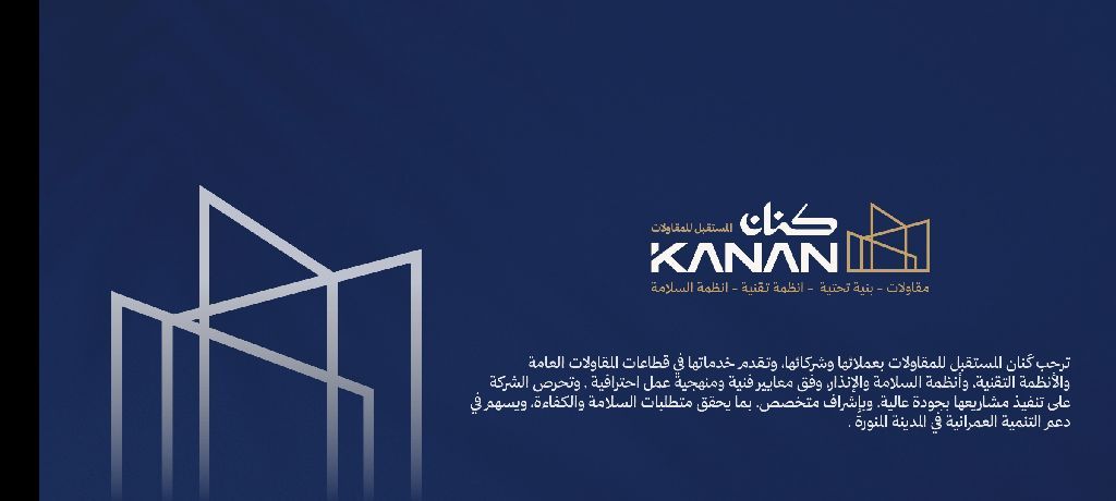 كنان المستقبل للمقاولات - المدينة المنورة نقدم خدمات المقاولات العامة وتنفيذ الفلل والعمارات والتشطيبات، اضافة الى توريد وتركيب أنظمة كاميرات المراقبة والأنظمة التقنية، وأنظمة السلامة والانذار ومكافحة الحريق مع اعتماد الدفاع المدني. تنفيذ احترافي، التزام بالجودة والسلامة، تسليم في الوقت حسب الجدول الزمني