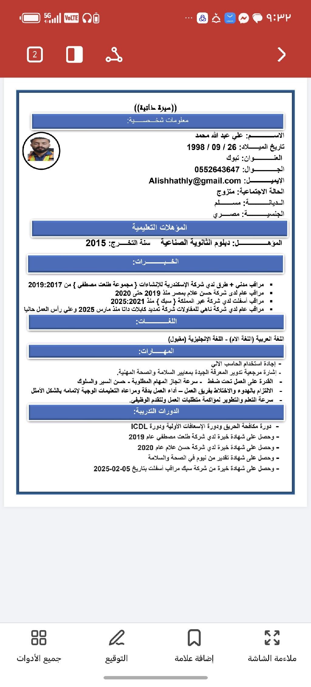 ابحث عن عمل مراقب مدني في مجال المعمار. حيث كنت مراقب في شركة المقاولون العرب. وكنت مراقب في شركة سبك السعودية. ومعي شهادة خبرة أقامه قابلة لنقل. رخصة قيادة سارية، أتحمل ضغط العمل تحت أي ظروف وايجيد برنامج الاكسل. ولدي خبرة في خمس سنوات في مجال مراقب مدني. وعندي معرفة بشوارع المدينة المنورة وعندي معرفة بشوارع مدينة ضبا وتبوك وجدة